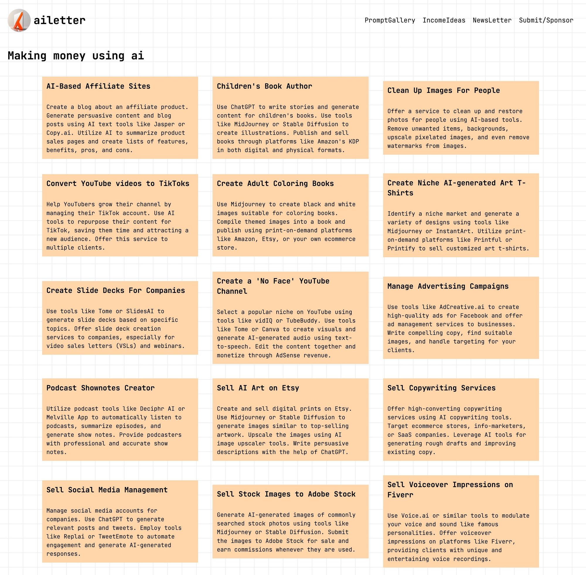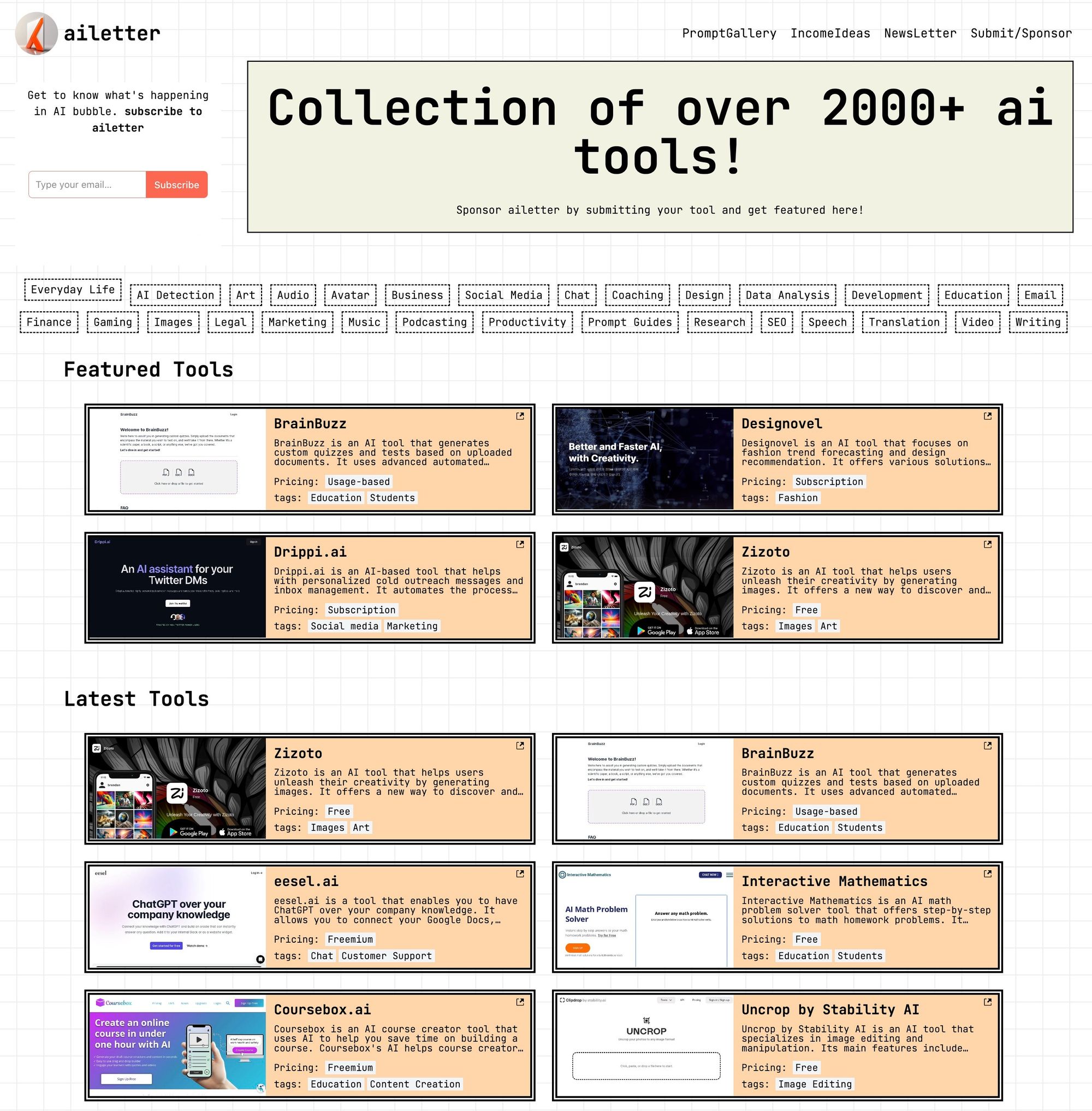 Ailetter.tech is an A.I. have a collection of sites with over 2000+ A.I. tools with ChatGPT prompt galleries and income ideas using AI tools.