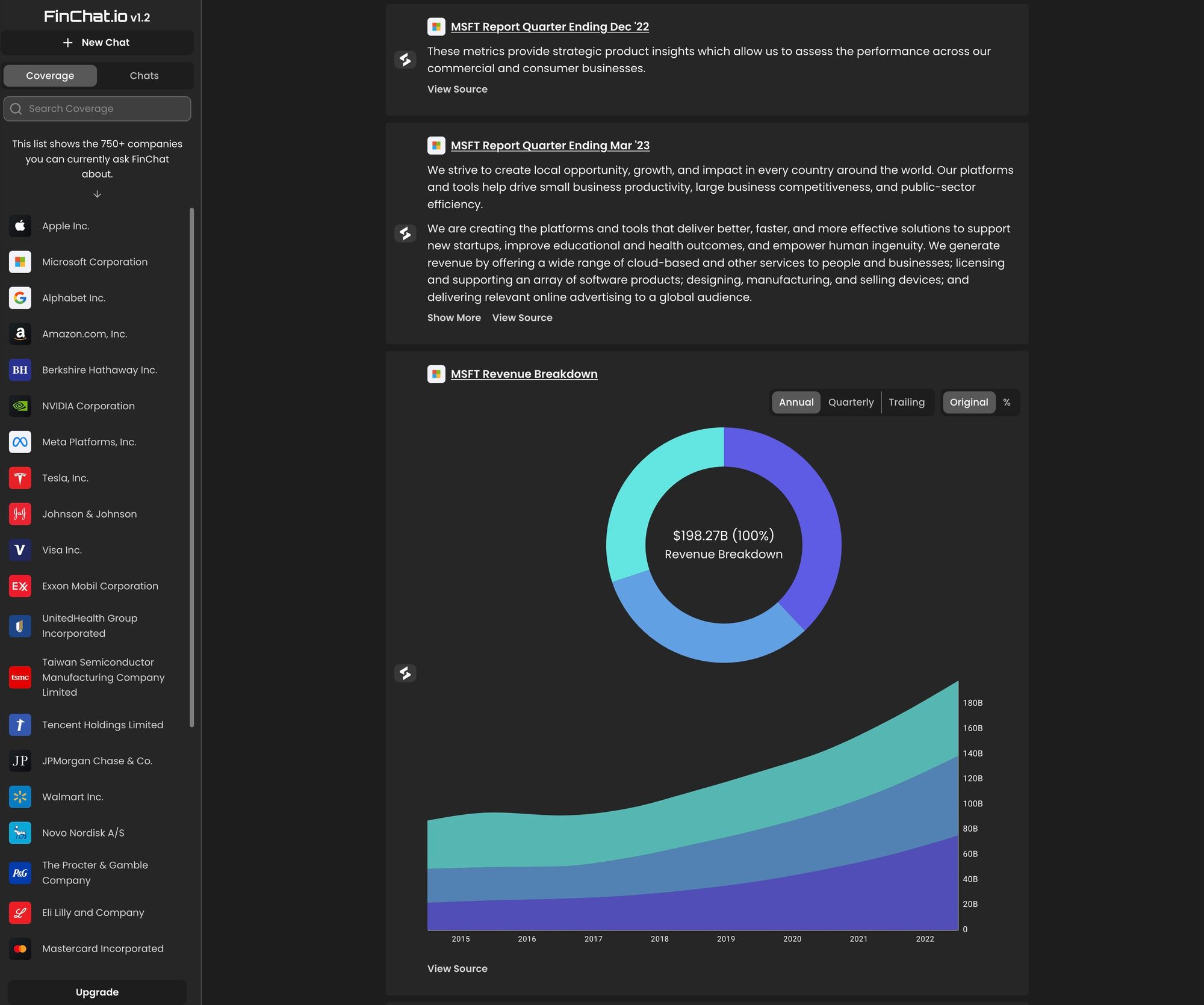 FinChat.io is a website that uses artificial intelligence to generate answers to questions about public companies and investors. It is a ChatGPT for Finance, which means it uses a natural language processing model to understand and respond to queries. FinChat.io provides reasoning, sources, and charts to support its answers. Users can ask FinChat about more than 750 companies that are listed on the website. FinChat.io also allows users to log in and switch between light and dark modes.